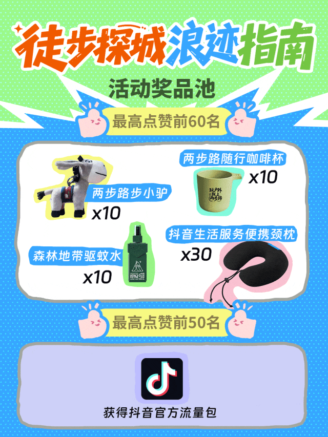 带话题 # 就爱这么过夏天 #、#徒步探城浪迹指南# ,打开抖音app打卡你的徒步旅途精彩瞬间 发布轨迹,就有机会瓜分官方奖励🎁。