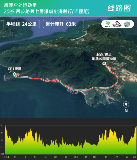 路线轨迹:大鹏国家地质公园博物馆→ 东涌社区 → 鲲鹏径第 20 段 → 大雁顶 → 鹿雁科考线 → 鹿咀码头 → 新东绿道 → 返回起点